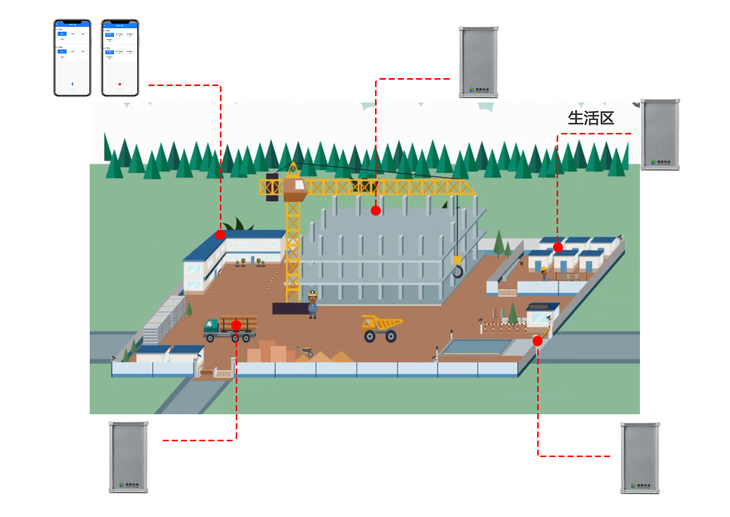 按生活區(qū)、作業(yè)區(qū)、塔吊覆蓋區(qū)、出入口等劃分廣播分區(qū),支持單點(diǎn)、分組、全區(qū)三種模式,避免"一喊全工地"。 -