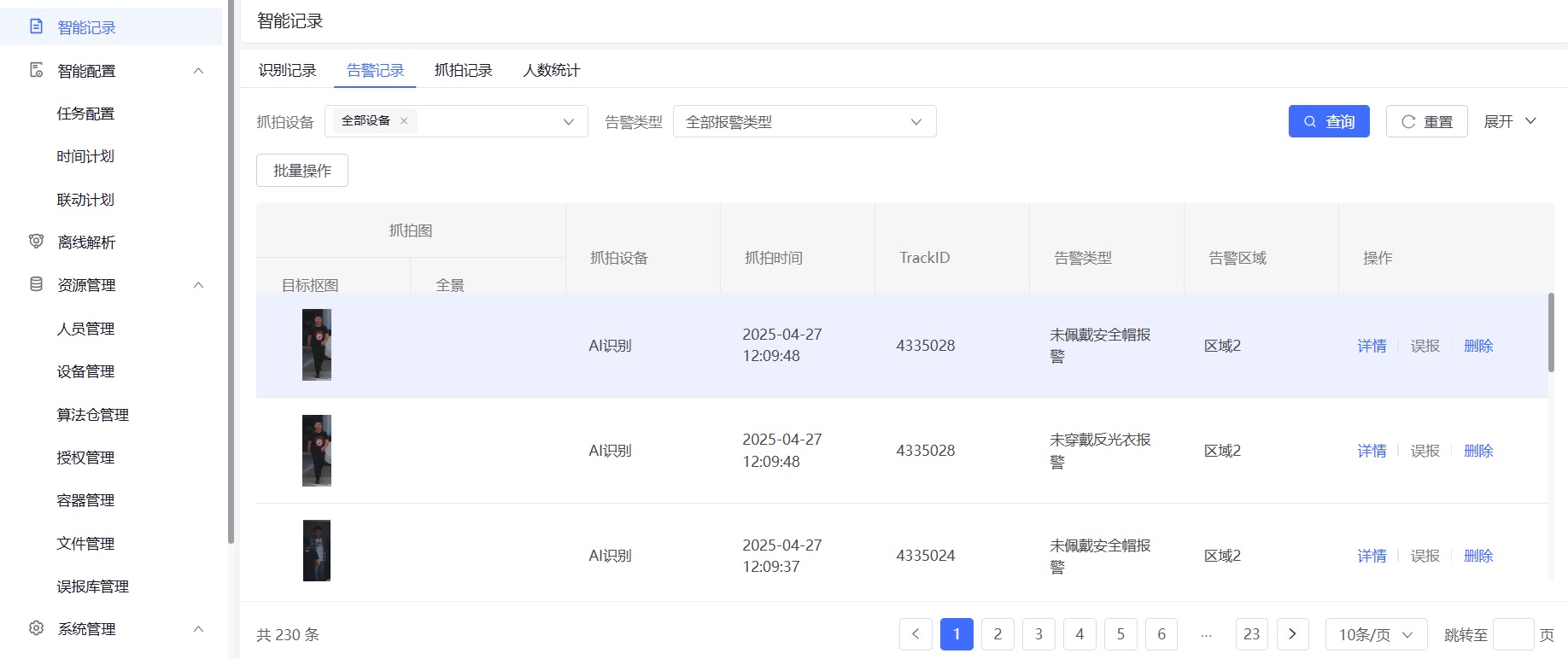違規(guī)行為自動(dòng)抓拍人臉,與實(shí)名制庫(kù)比對(duì),精準(zhǔn)定位責(zé)任人,生成"時(shí)間-地點(diǎn)-行為-人員"四聯(lián)單。 -