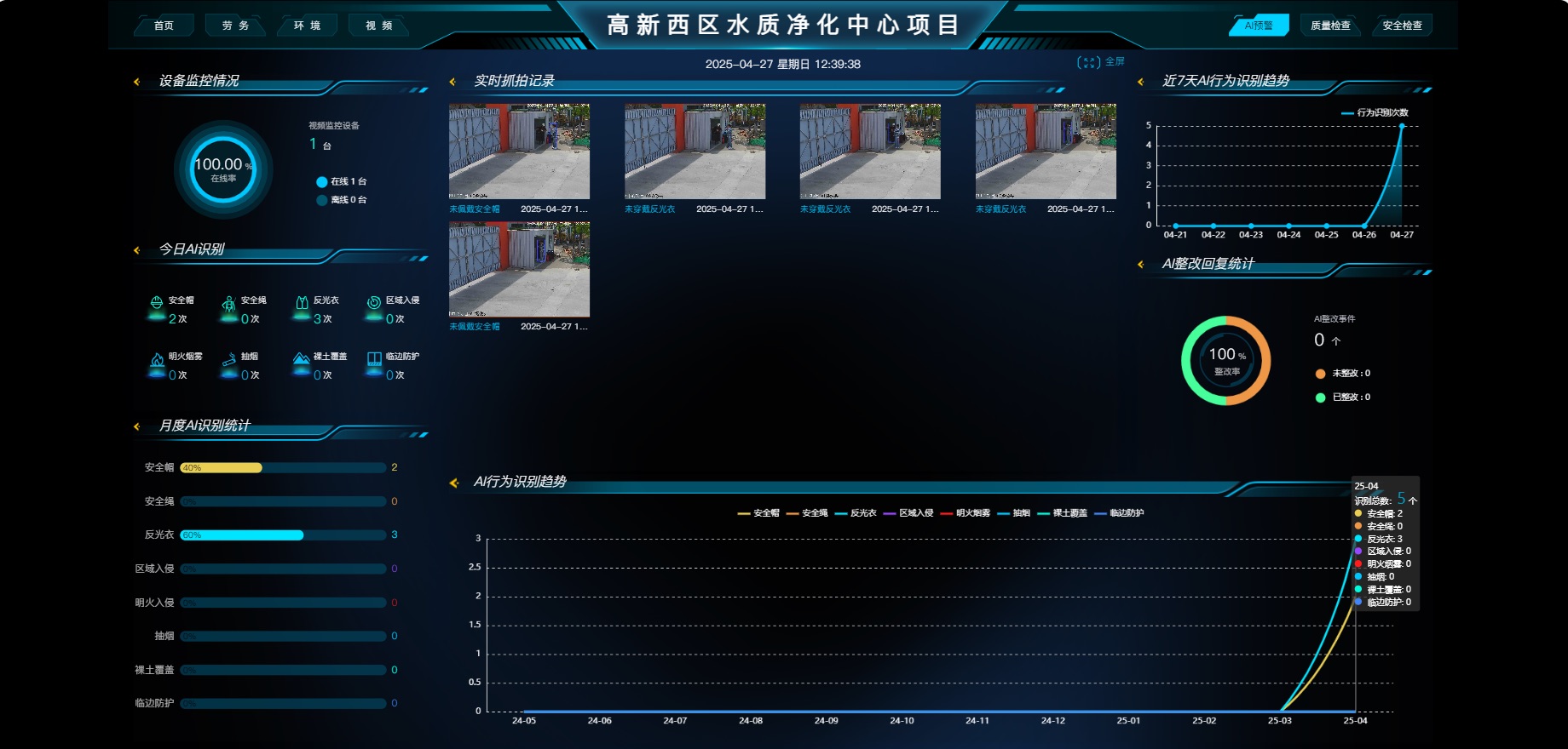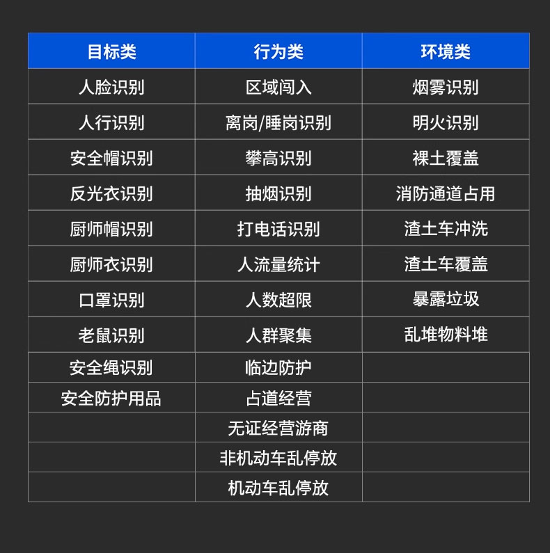 實(shí)時(shí)識(shí)別未戴安全帽、未穿反光背心、吸煙、打電話、區(qū)域入侵、攀爬臨邊、高空拋物、睡崗離崗等20+類違規(guī)行為,準(zhǔn)確率≥95%。